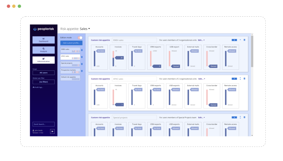 Visually setup your risk appetiteBy using the risk indicators defined, for every department or group of people using any arbitrary criterion (e.g. Senior managers), now visually set thresholds: For example, Senior managers are allowed to access all the CRM, but junior Sales members must not have access to more than a few accounts. Adjust the thresholds as your risk appetite evolves, and immediately get the feedback of how many people are now within or out of risk appetite.