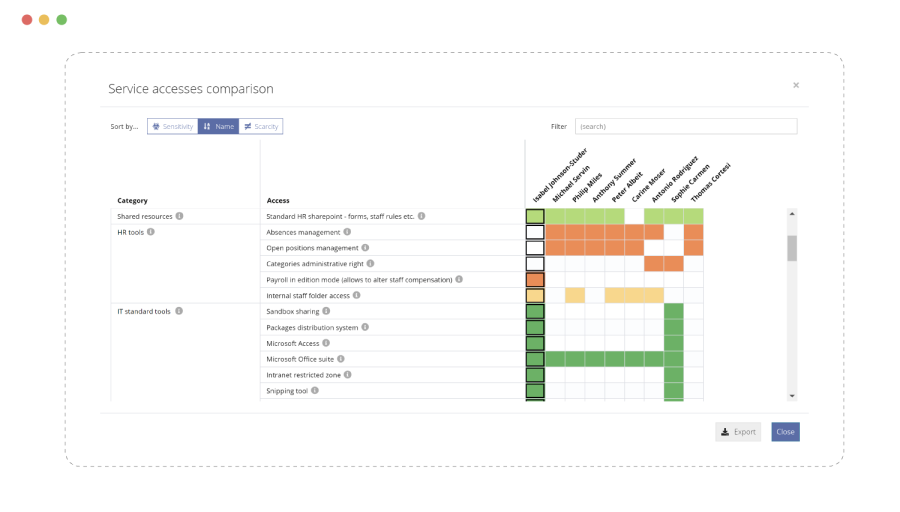 Compare every list of assets, IT or physical accesses granted to your staff in interactive comparison grids, and even make them interactive to control other applications (e.g. access management tools).