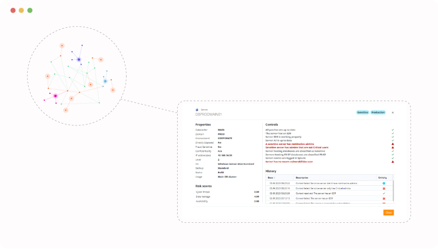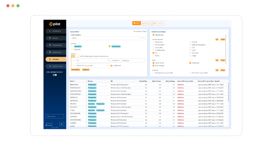 Centralized knowledgePowered by our flagship CogTL® engine, Pilot is the perfect interface to easily access all the contextualized information regarding your key assets: being in a cybersecurity context (servers, workstations, applications, services, networks, third parties…), or any business domain (clients, contracts, product …): Pilot will show you the result of all associated controls easily, as well as investigate or comment on failures.